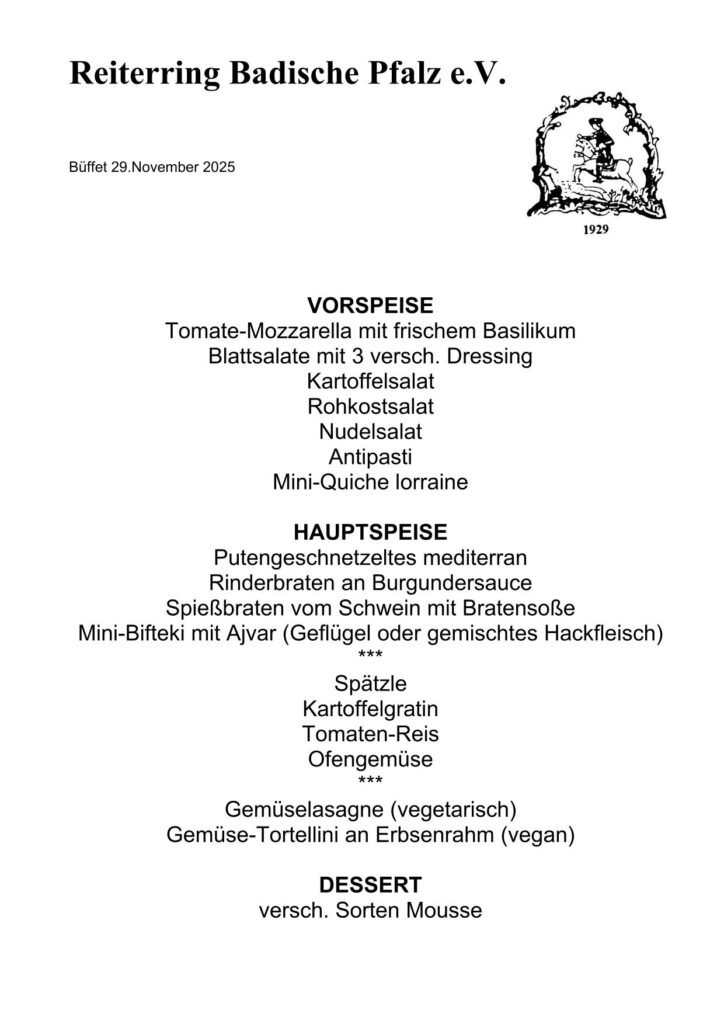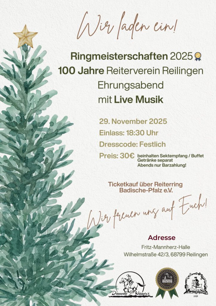 Hier können Sie für den Ehrungsabend am 29. November 2025 Eintrittskarten bestellen (Anmeldeschluss 01. November 2025). Vorname, Nachname Mail Verein Telefon Kartenbestellung Ehrungsabend RR Badische Pfalz Hiermit bestelle ich kostenpflichtig Eintrittskarte(n) incl. "Büffet" Hiermit bestelle ich kostenpflichtig Eintrittskarte(n) incl. "Büffet vegetarisch" Hiermit bestelle ich kostenpflichtig Eintrittskarte(n) incl. "Büffet vegan" Deine Nachricht (optional, bei Bestellung von mehreren Karten können hier die Personen genannt werden) Hiermit bestelle ich o.g. Anzahl Eintrittskarten Den Kartenpreis in Höhe von € 30,-- / Karte überweise ich auf das Ringkonto IBAN DE35 5479 0000 0008 1527 05 Der Reiterring Badische Pfalz e.V. ist berechtigt, die auf diesem Antrag gemeldeten Daten in regionalen oder überregionalen Verzeichnissen und Informationsmaterialien zu veröffentlichen, auf Anfrage weiterzugeben und im Internet unter www.reiterring-badische-pfalz.de einzutragen. Der Speicherung meiner Daten stimme ich zu. 70